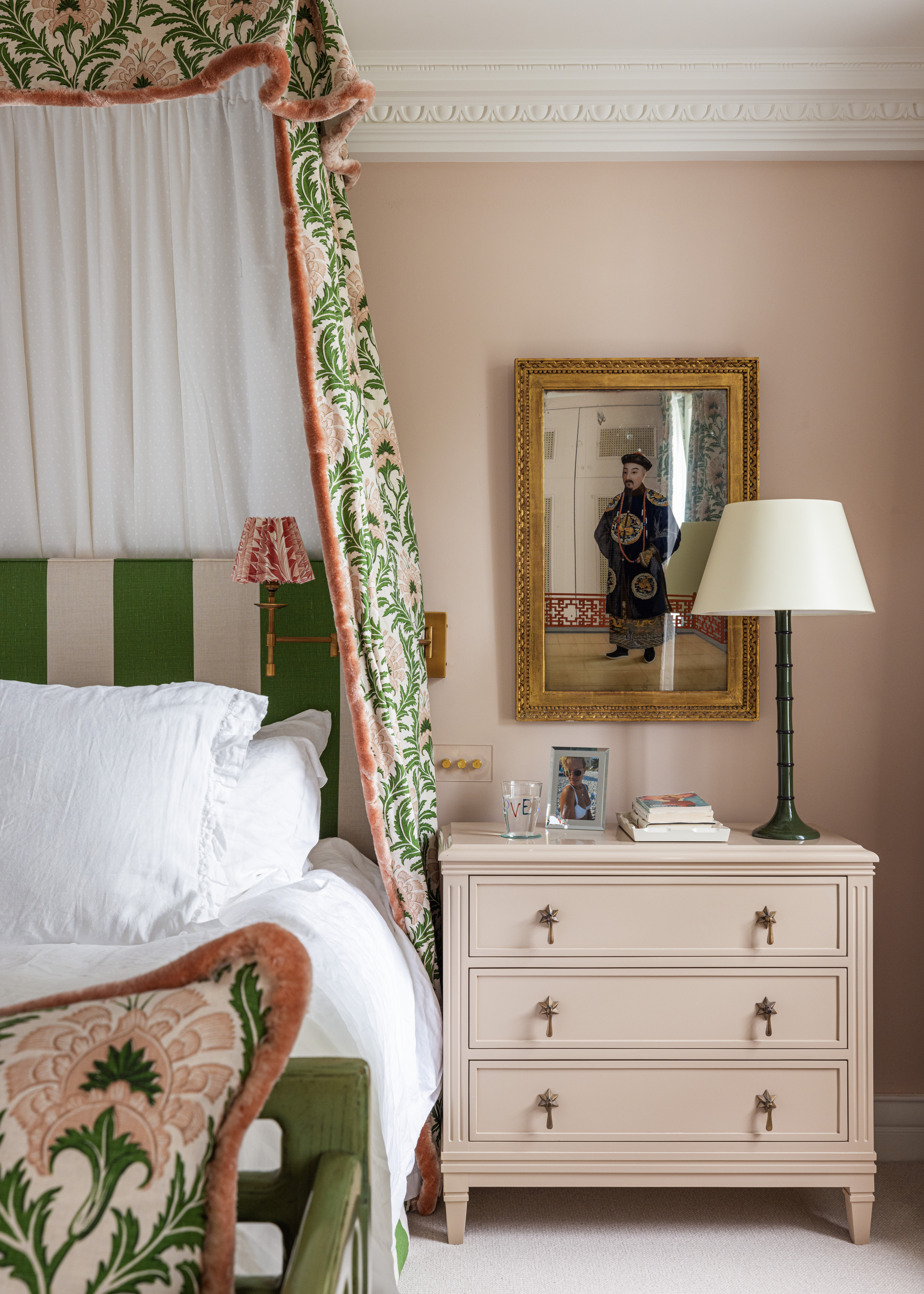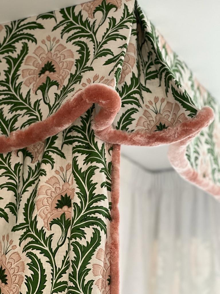 What dreams are made of. A lavish flourish of Aria Silk Brush Fringe in Blush traces the edge of a botanically patterned bed curtain, adding sheen and romance to an already sumptuous bedroom.
