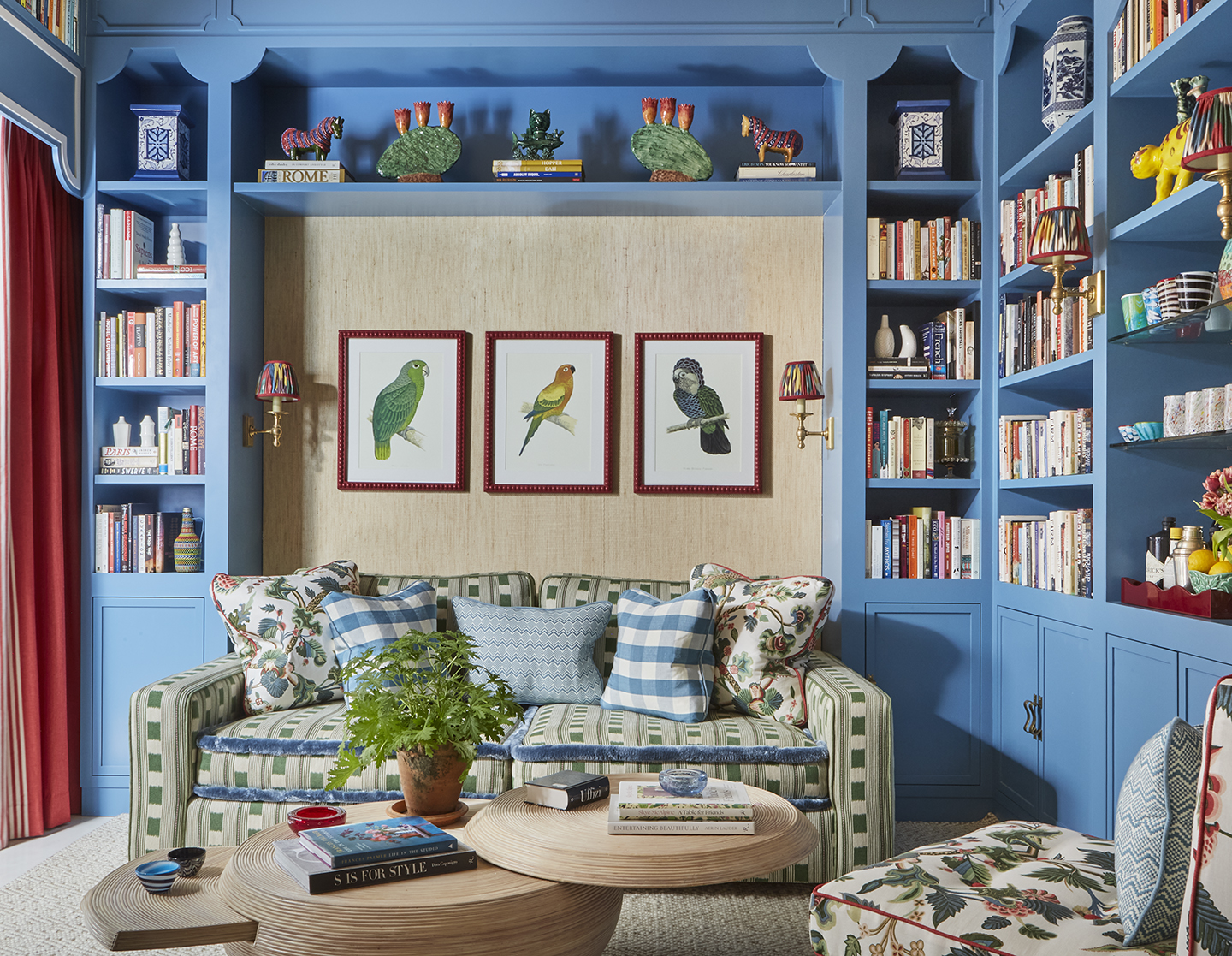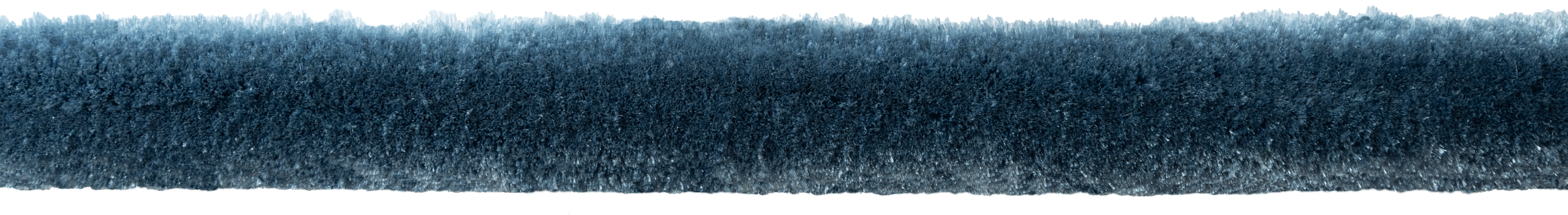 Silken touches from Singapore... In a magnificent townhouse media room, sofa seat cushions are finished with the lustrous Aria Silk Brush Fringe in Wedgewood, echoing the enveloping hue of the surrounding azure bookcases.