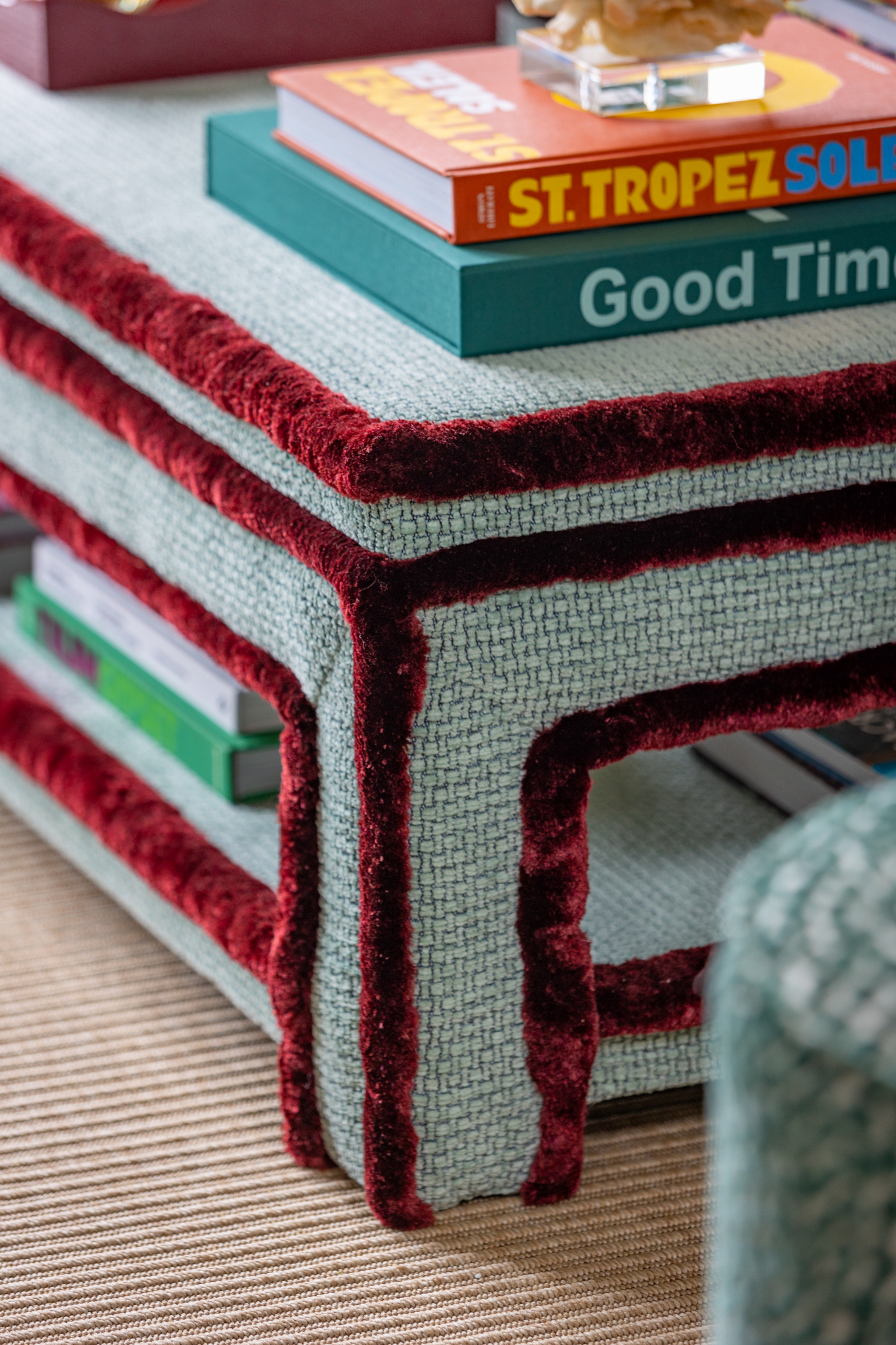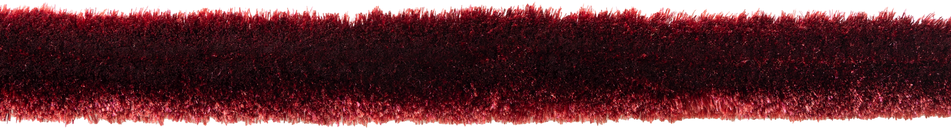 In another plush pop of Ruby, the Aria Silk Brush Fringe makes a bold statement on a tailored living room ottoman, its dimensional profile and rich hue adding depth and character to the space.