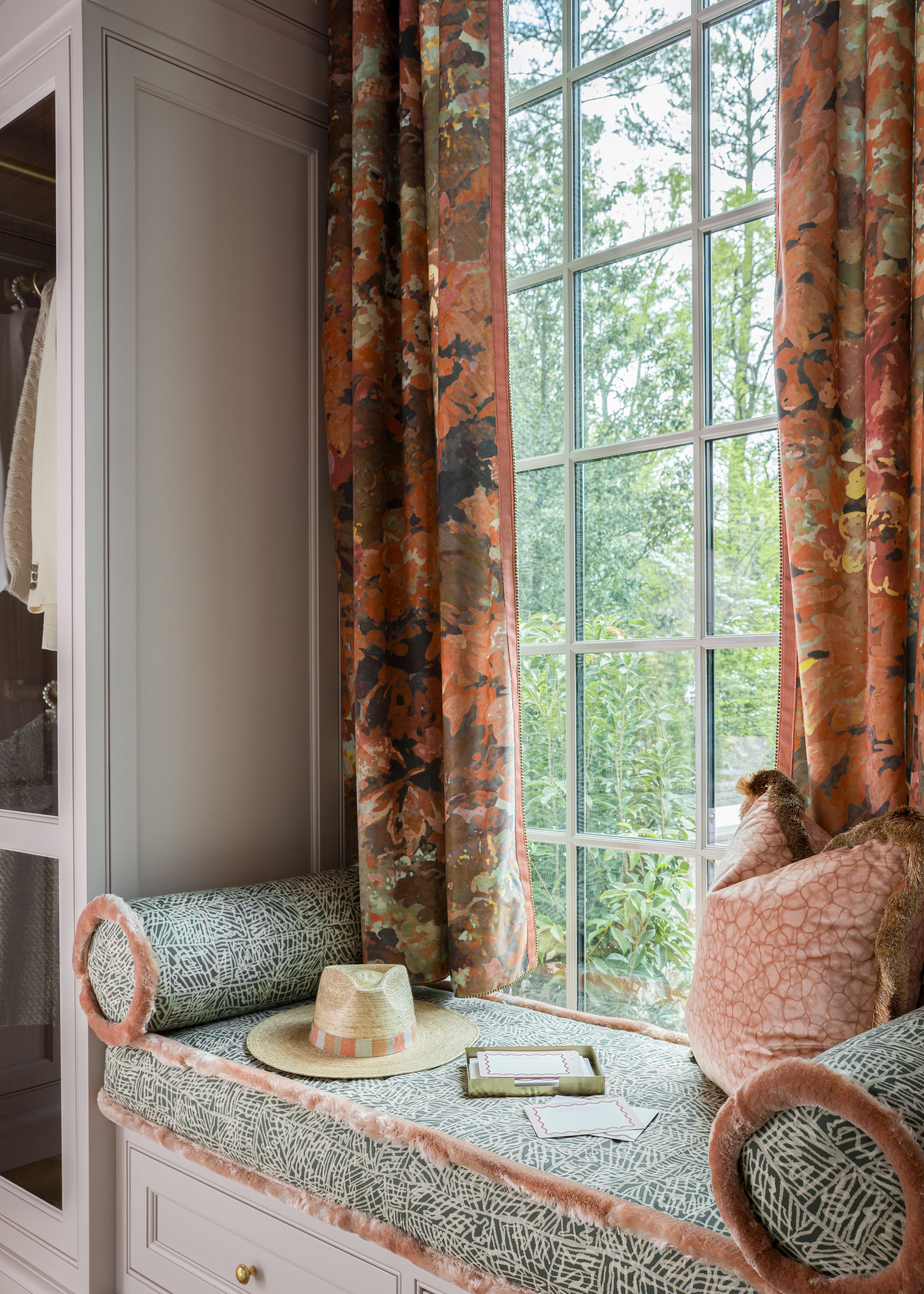 The pink and green palette continues in a captivating walk-in closet, where a tailored window seat is crowned with the Aria Silk Brush Fringe in Blush — adding a luminous, graceful edge that brings polish to the abstracted upholstery.