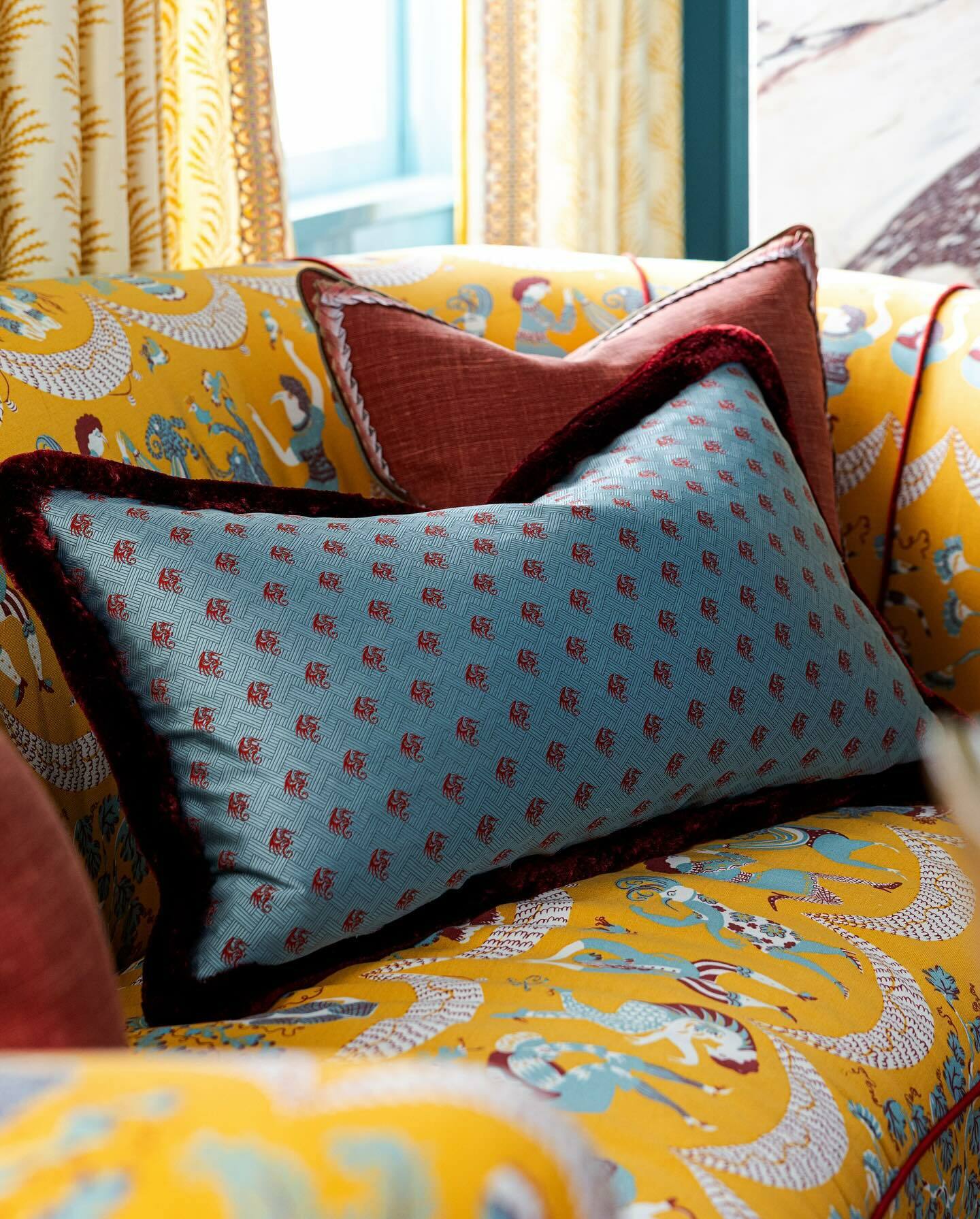 Elevated, with a touch of drama. The Aria Silk Brush Fringe in Ruby draws the eye to a beautifully printed lumbar pillow, its vivid edge mirroring the room’s refined primary palette.