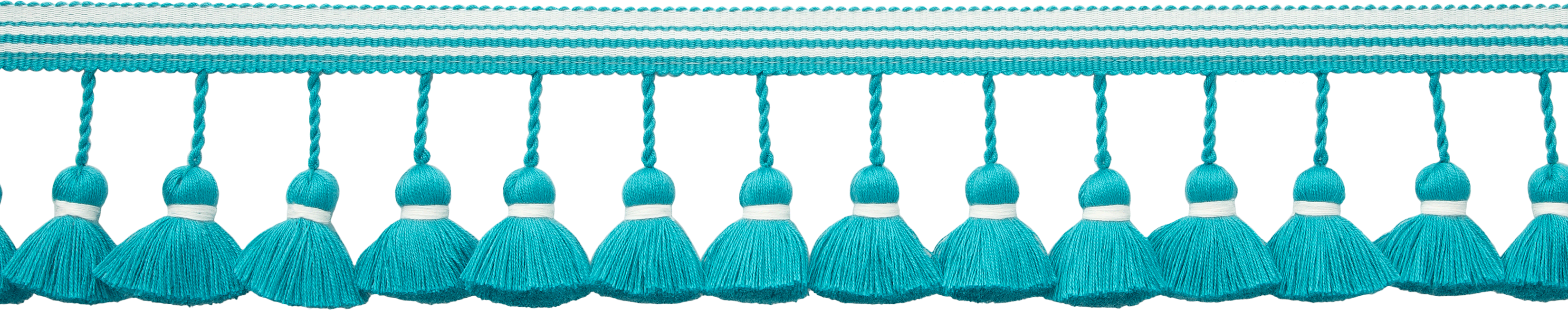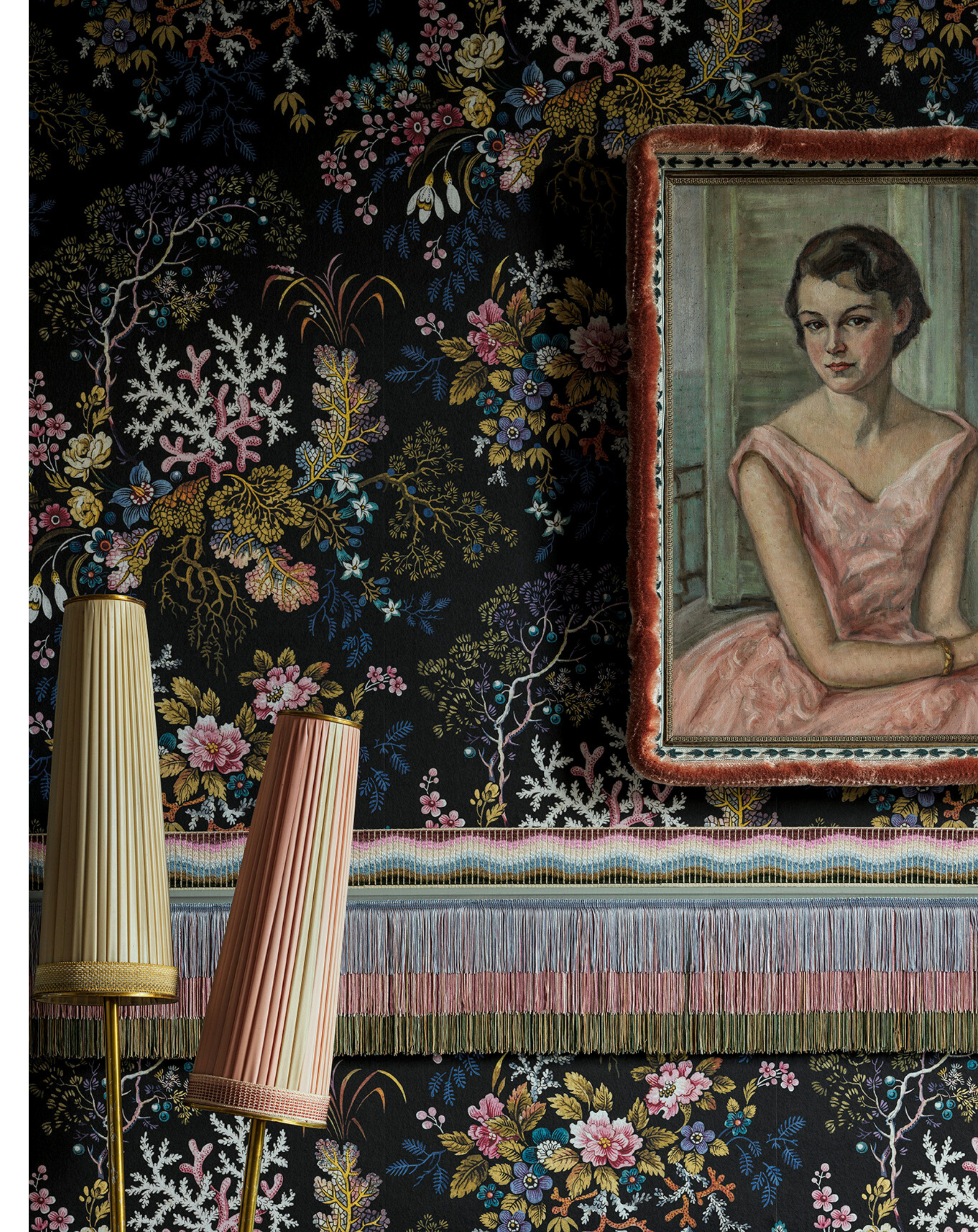 Where flowers bloom, fringe follows. The Oceanside Tassel Fringe in Capri climbs across classic wall moldings, a jolt of electric teal that echoes the upholstery below. Between the tassels, a painted portrait is framed with a dimensional duo, the Aria Silk Brush Fringe in Blush and Bagatelle Velvet Border in Dewdrop by Timothy Corrigan, mirroring the artwork’s petal pinks and muted greens.