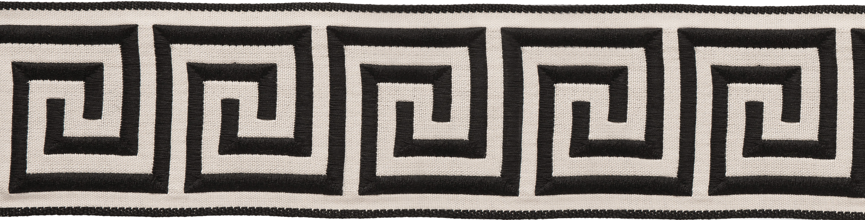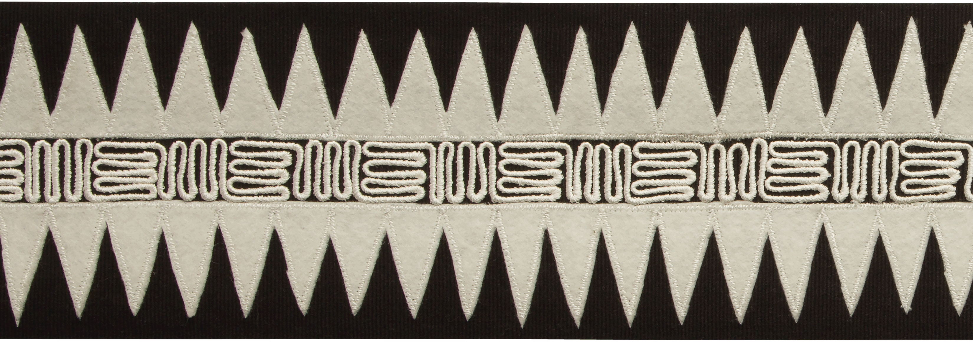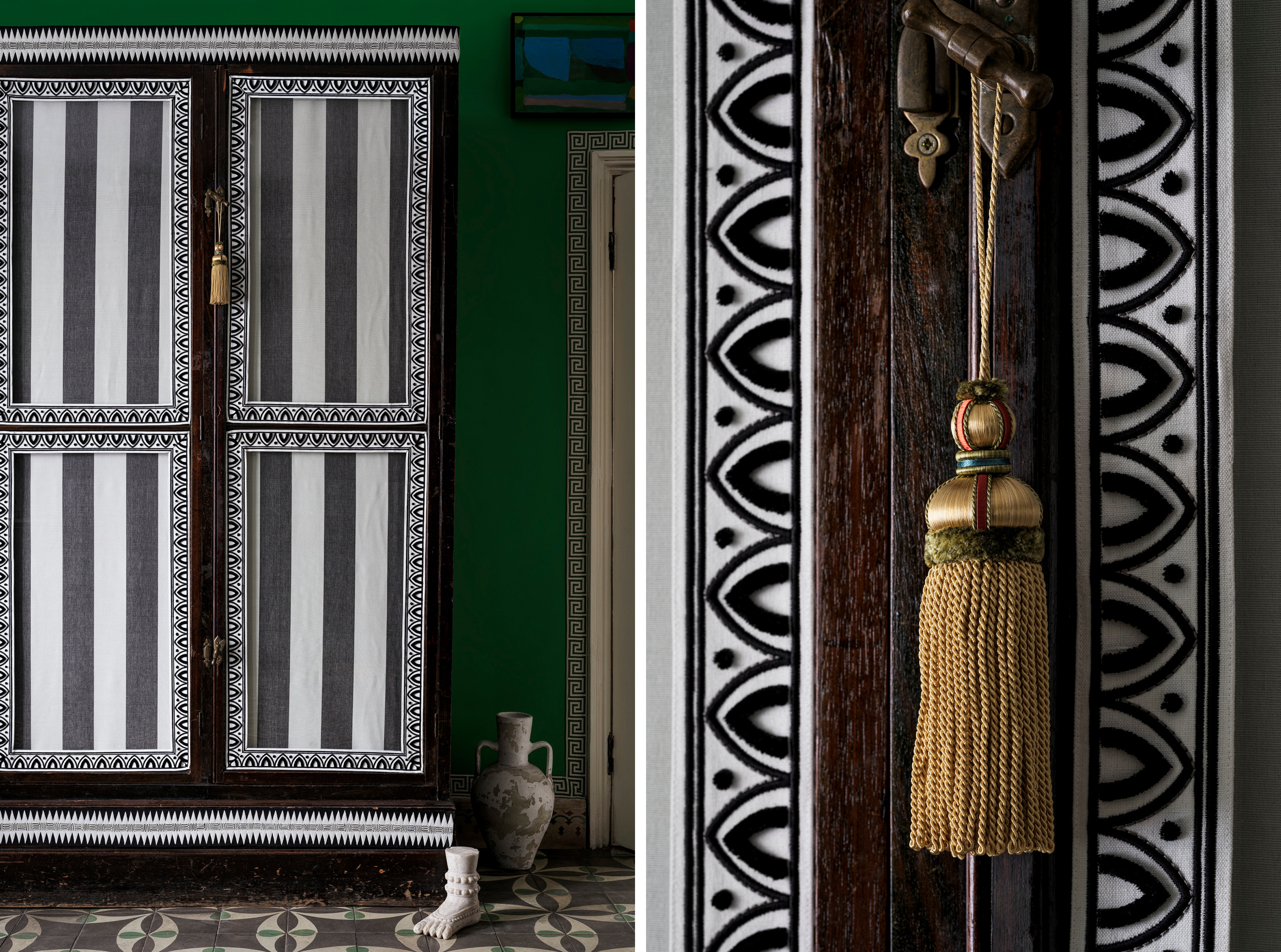 Geometric details that transform... The Alessia Velvet Border in Ebony adds contrasting pattern to four wide-striped panels, while the Corrales Appliqué Border in Piñon zigzags along the top and bottom of this antique dresser. The Aristotle Greek Key in Classic White and Black traces along the wall behind, continuing this rhythmic movement into the rest of the room. A final flourish, the Margaux Key Tassel in Mandarine hangs from the brass knob, adding to its warmth and luster.