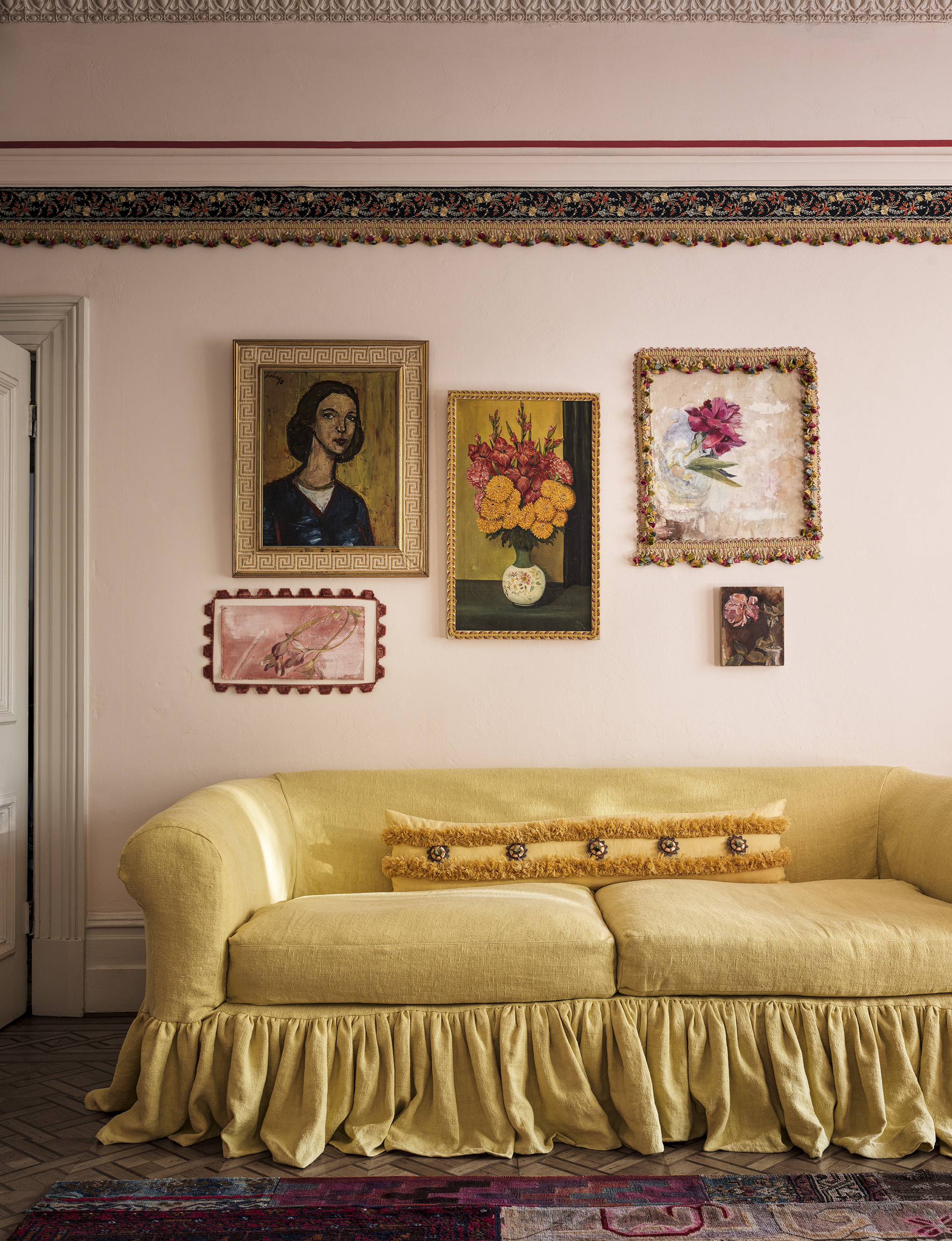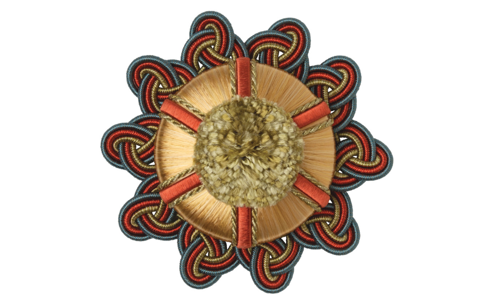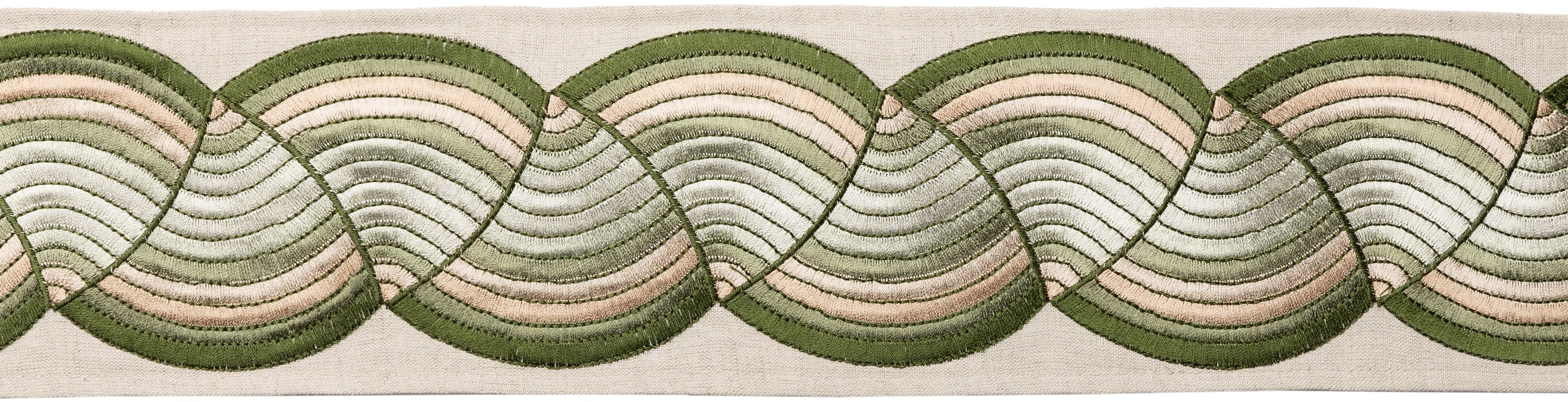 The time-honored gallery wall receives an unexpected update. Four fantastical passementerie frames infuse movement and unique flair into a curated collection of artwork. The Dorset Velvet Scallop creates a striking silhouette, grounding the delicate painting with its rich Coral hue. The Aristotle Greek Key in Golden Strie, Veranda Linen Crete in Waterlily, and Palais Scalloped Tassel Fringe in Jardin highlight the artwork’s palette in three distinct ways, creating a harmonious yet varied dialogue between trim and art.