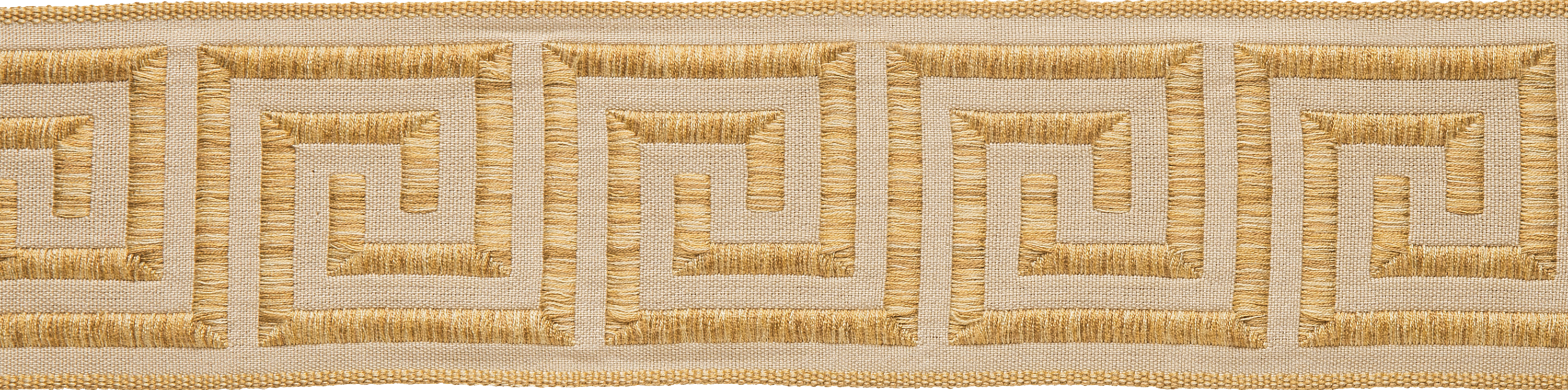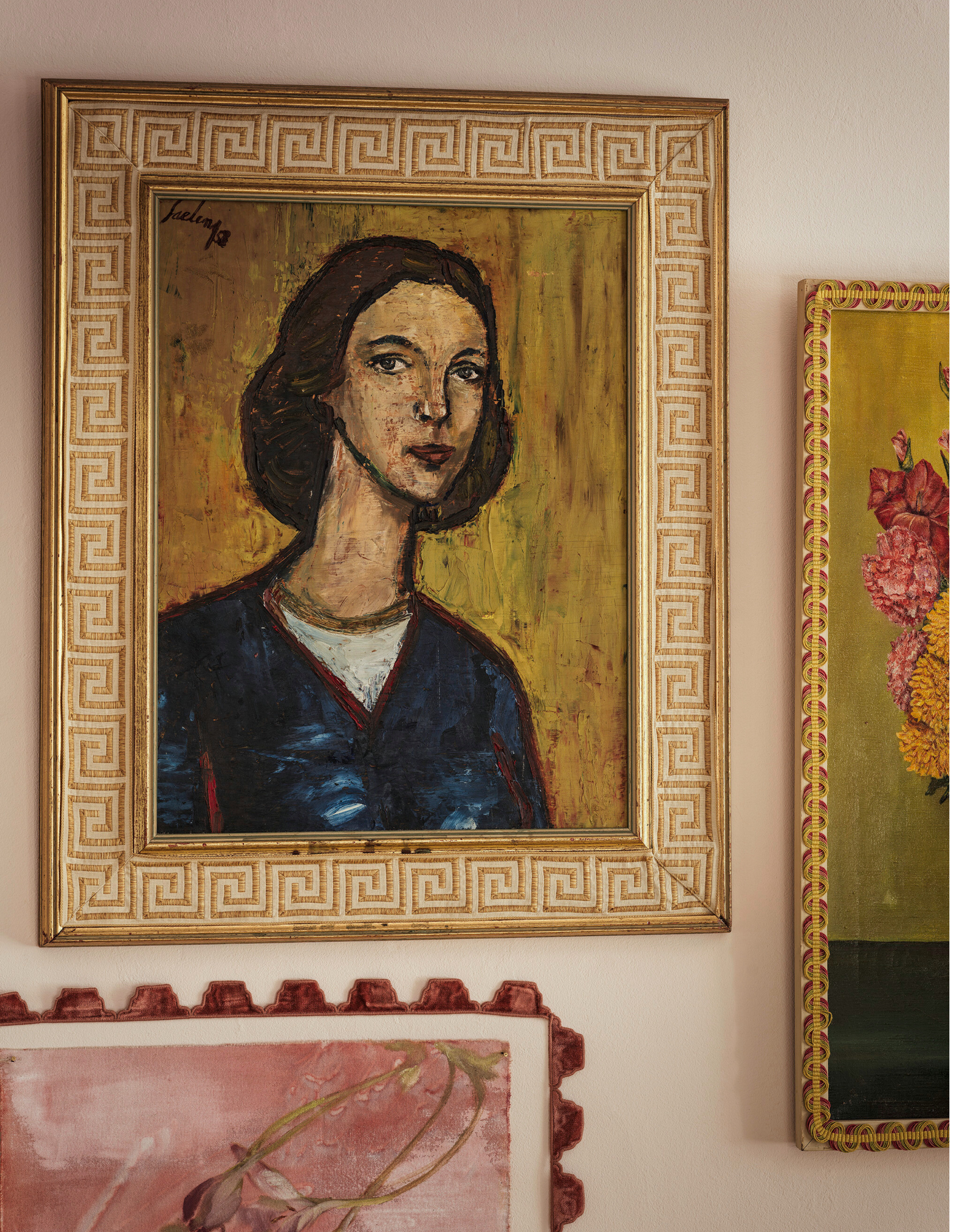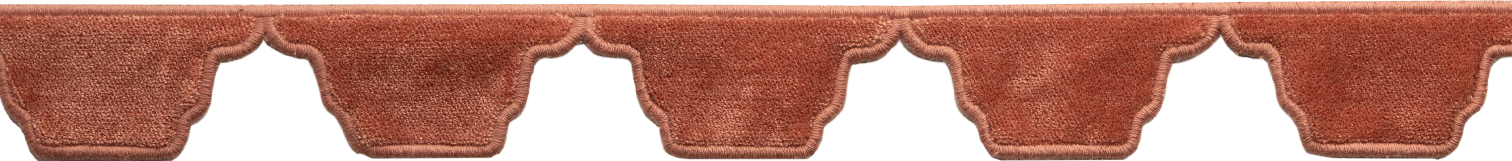 The time-honored gallery wall receives an unexpected update. Four fantastical passementerie frames infuse movement and unique flair into a curated collection of artwork. The Dorset Velvet Scallop creates a striking silhouette, grounding the delicate painting with its rich Coral hue. The Aristotle Greek Key in Golden Strie, Veranda Linen Crete in Waterlily, and Palais Scalloped Tassel Fringe in Jardin highlight the artwork’s palette in three distinct ways, creating a harmonious yet varied dialogue between trim and art.