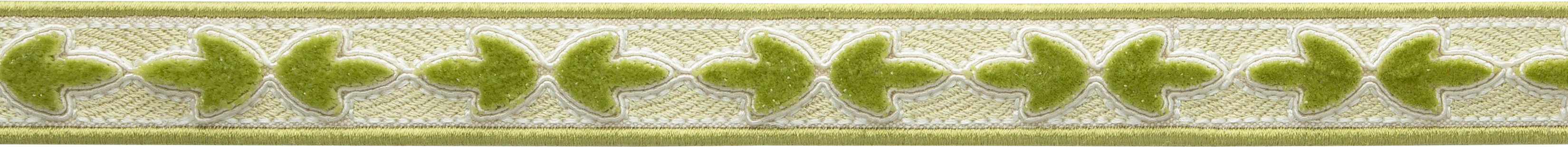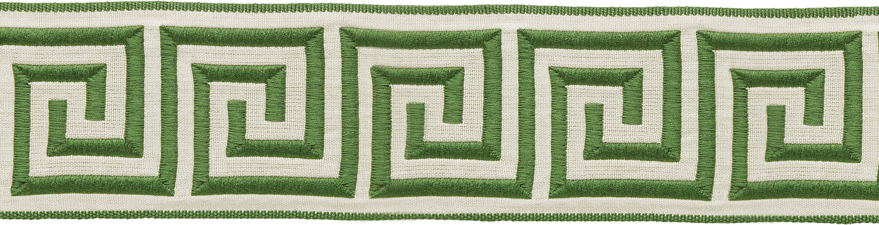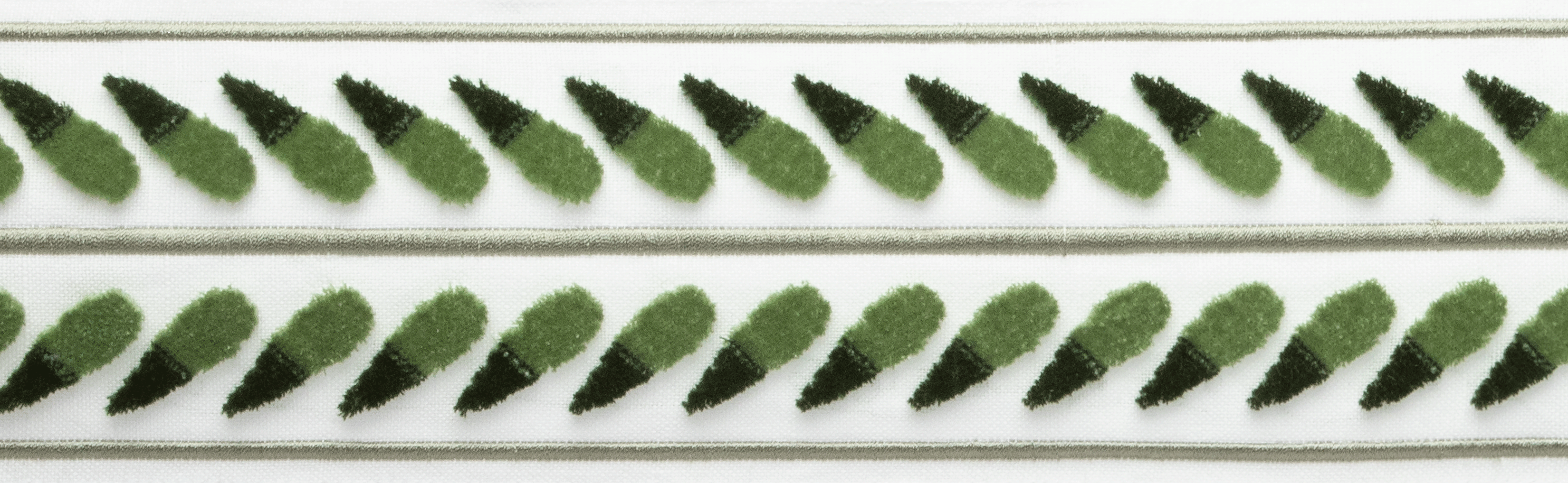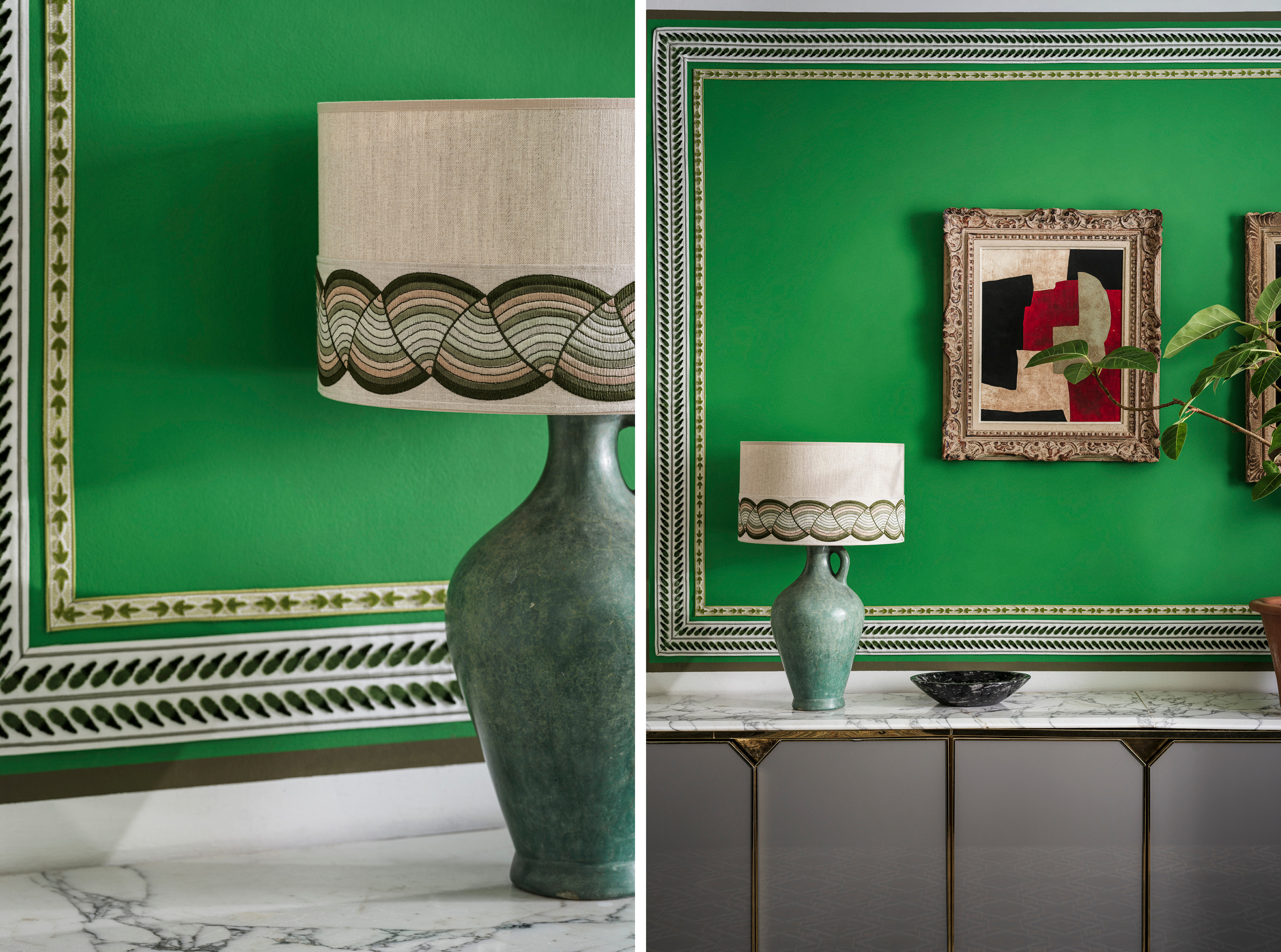 Leaning into green, the dimensional Maxim Velvet Border in Emerald and Bagatelle Velvet Border in Fern by Timothy Corrigan offer a contemporary twist on traditional frame molding. The Elora Embroidered Border in Green Tea completes the look, bringing a simple lampshade into the verdant scheme.