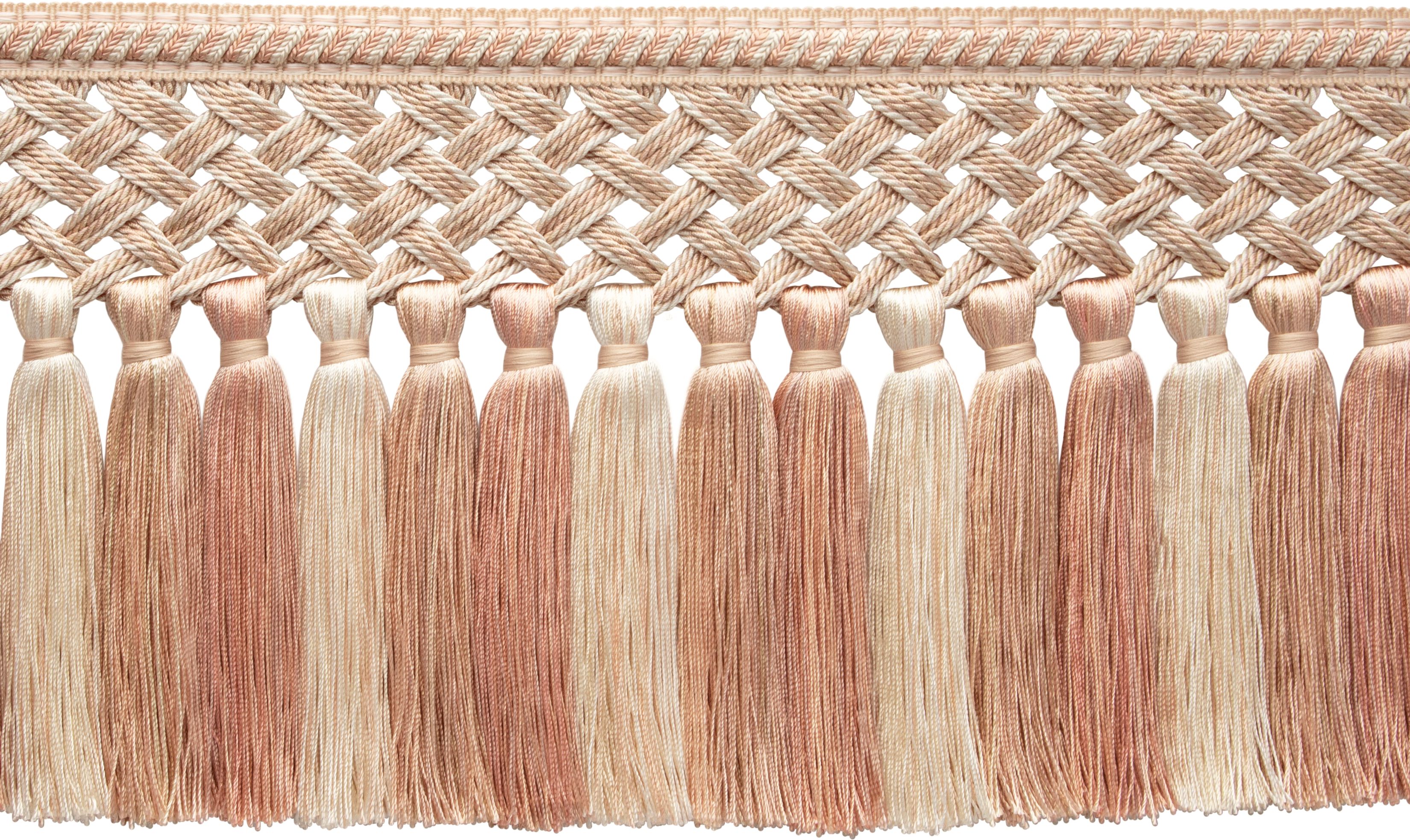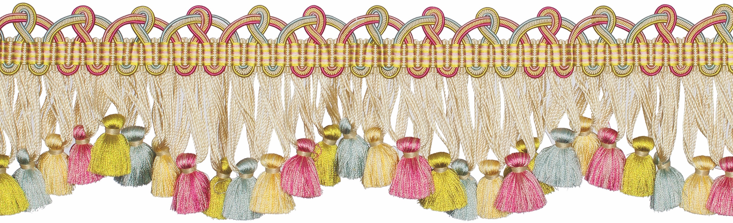 Doubling down on fringe, we continued to experiment with chair rail trim, layering the Elementi Tiered Fringe in Carciofo with the coordinating Elementi Ombré Border, both by Maddux Creative, for a more dramatic alternative to the Oceanside Tassel Fringe.