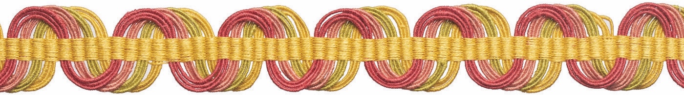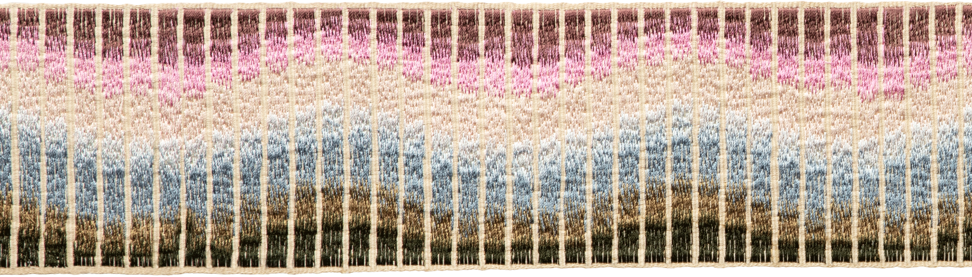 The Antoinette Embroidered Border in Sapphire underscores the pink picture rail above, accompanied by the French Grosgrain Border in Ruby and Palais Scalloped Tassel Fringe, mirroring the frame below.