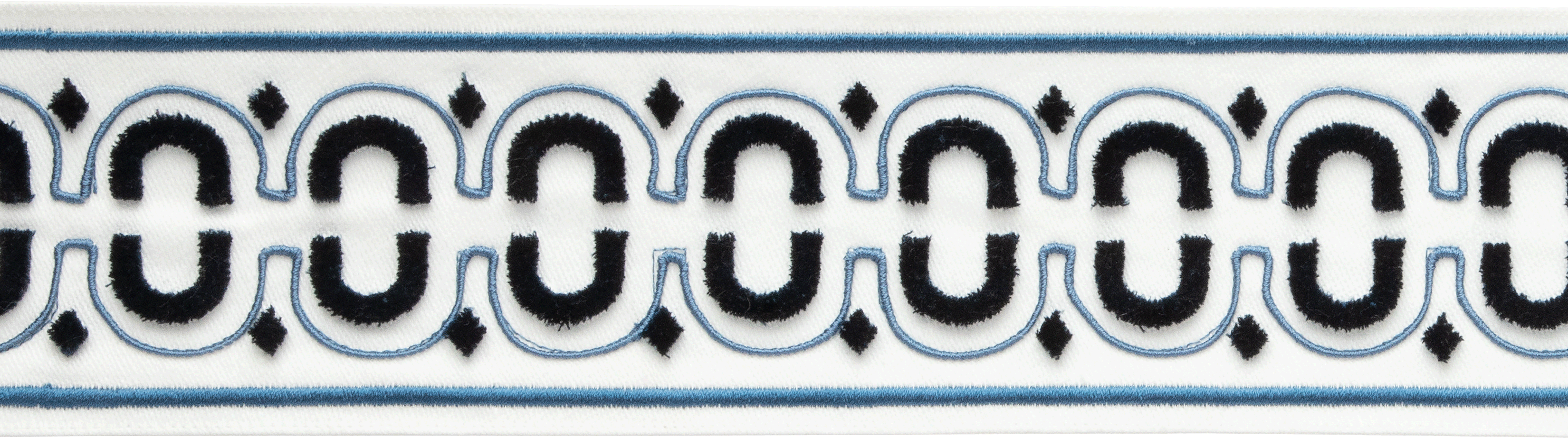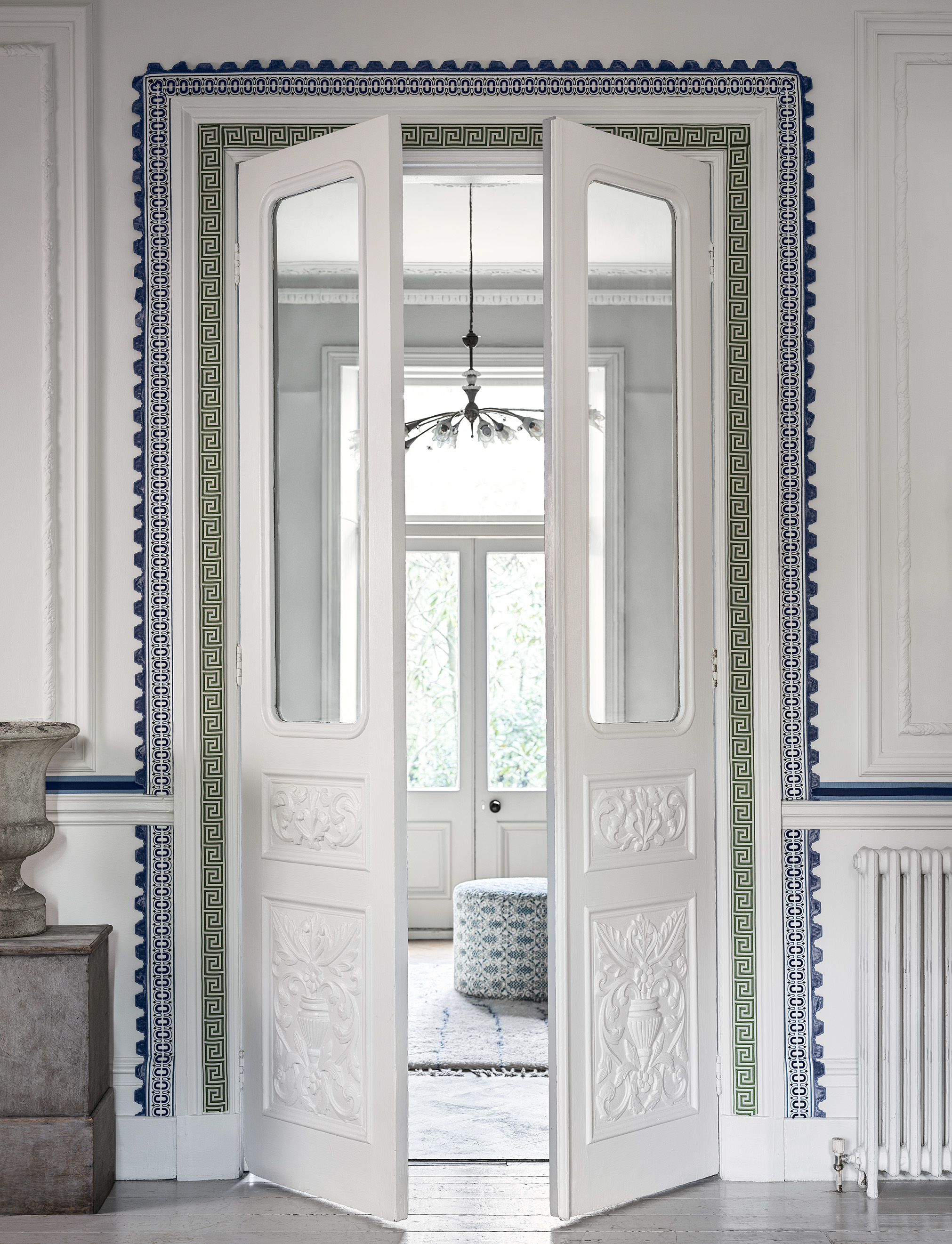 Graphic and tailored, the Dorset Velvet Scallop in Porcelain, Flórián Velvet Border in Imperial, and Aristotle Greek Key in Fern frame a double doorway, set between crisp chalk-white moldings. Along the chair rail, French Grosgrain Ribbon in Prussian is layered over the Tarantella Pleated Border in Mediterranean to create a bold, dimensional blue stripe.