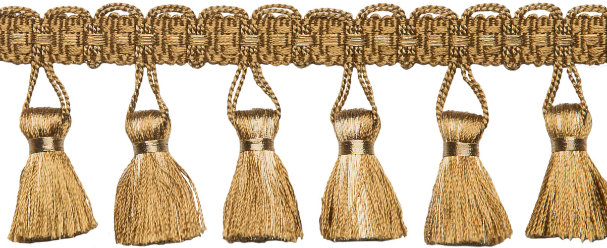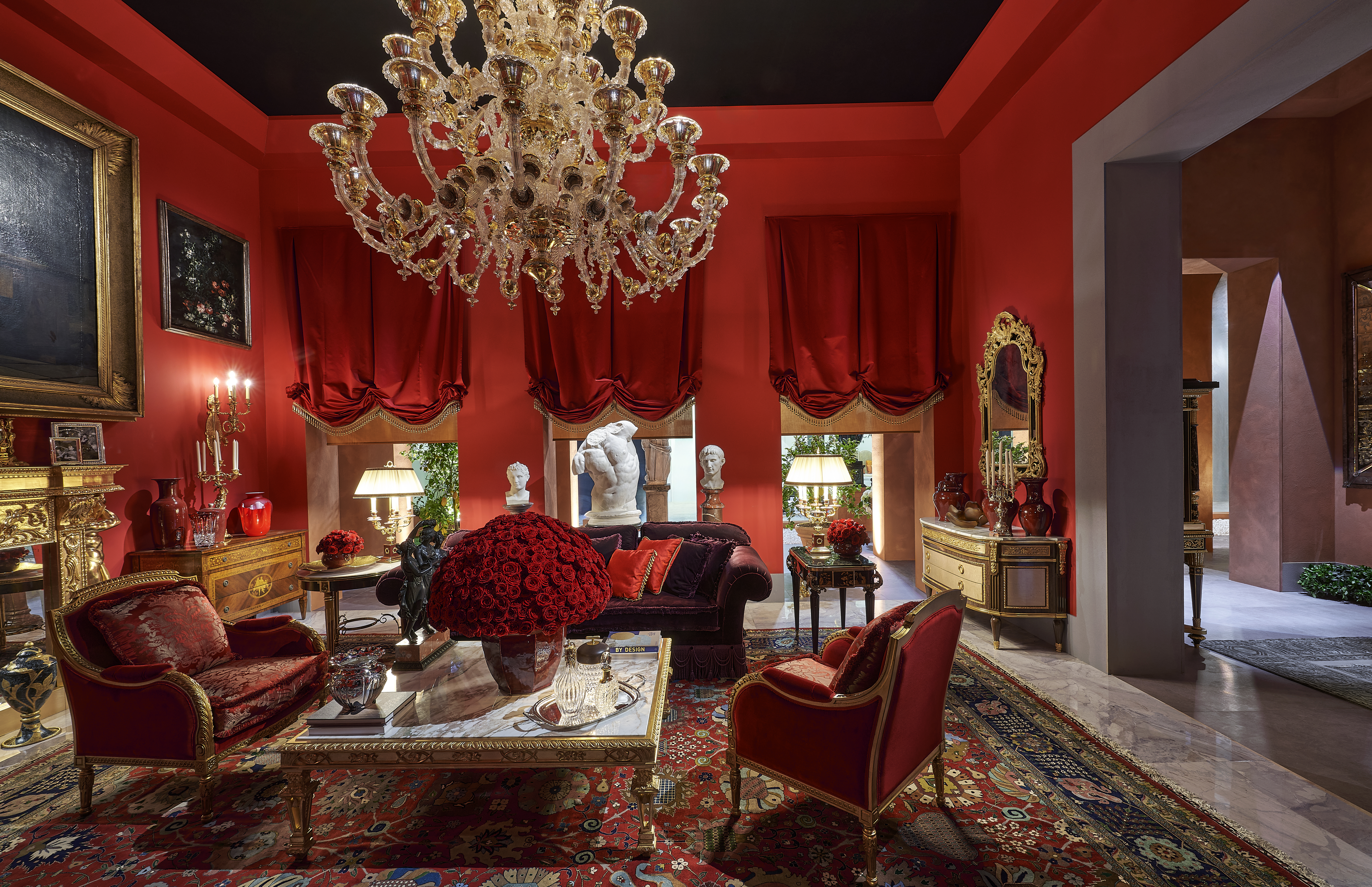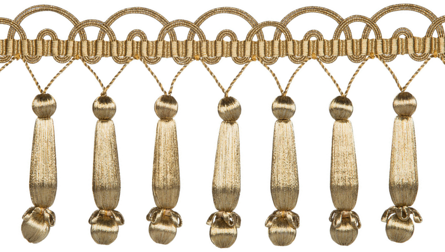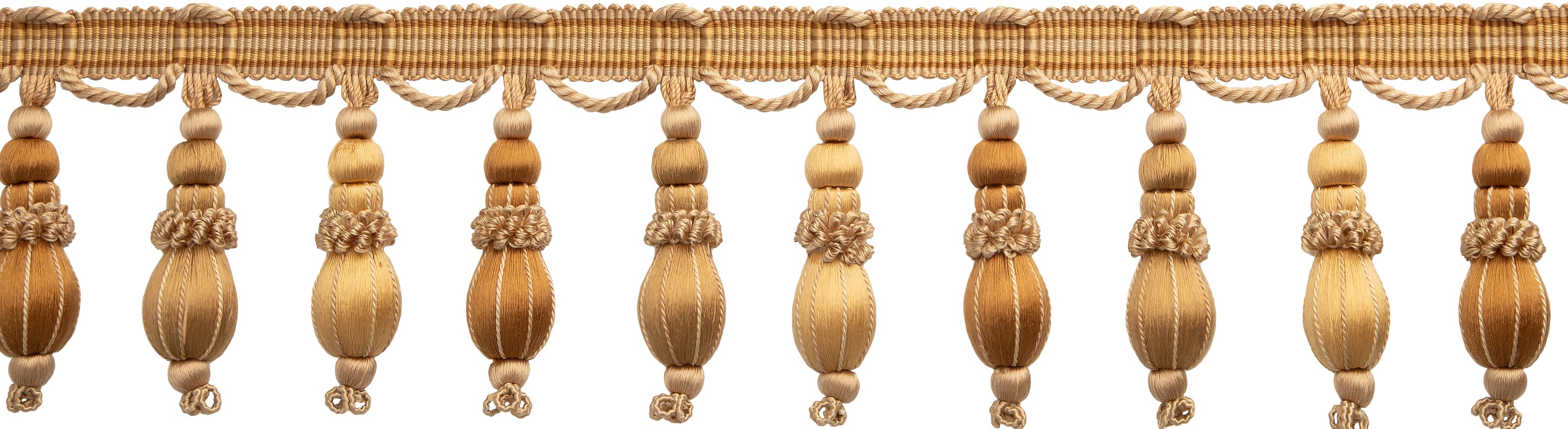 Few pairings feel more timeless than red and gold. In the Red Salone, golden trimmings gleam, from pillows edged in Aurelia Cord in Honey and Oberon Tassel Fringe in Antique Gold to the coordinating Oberon Triple Beaded Fringe cascading from each drape.