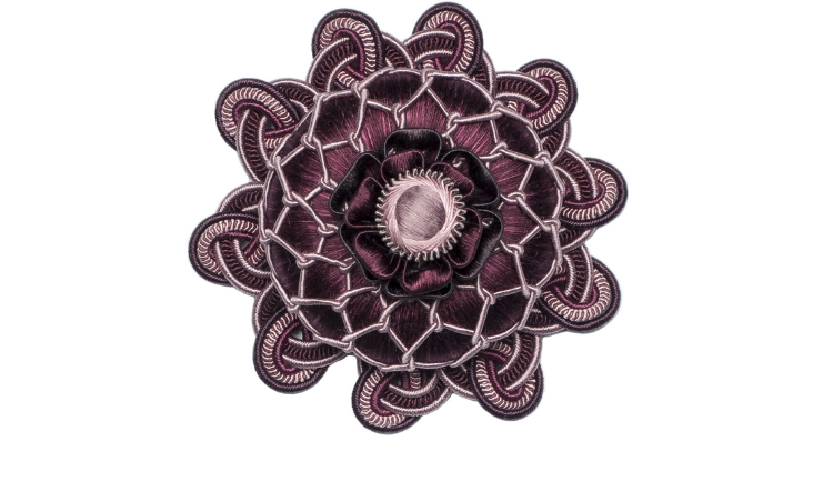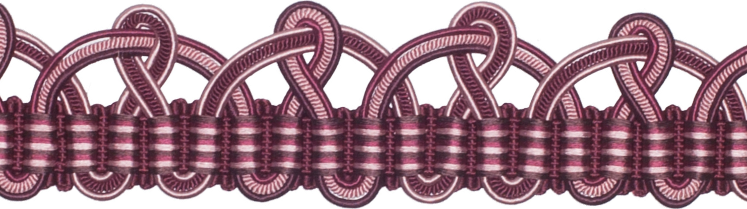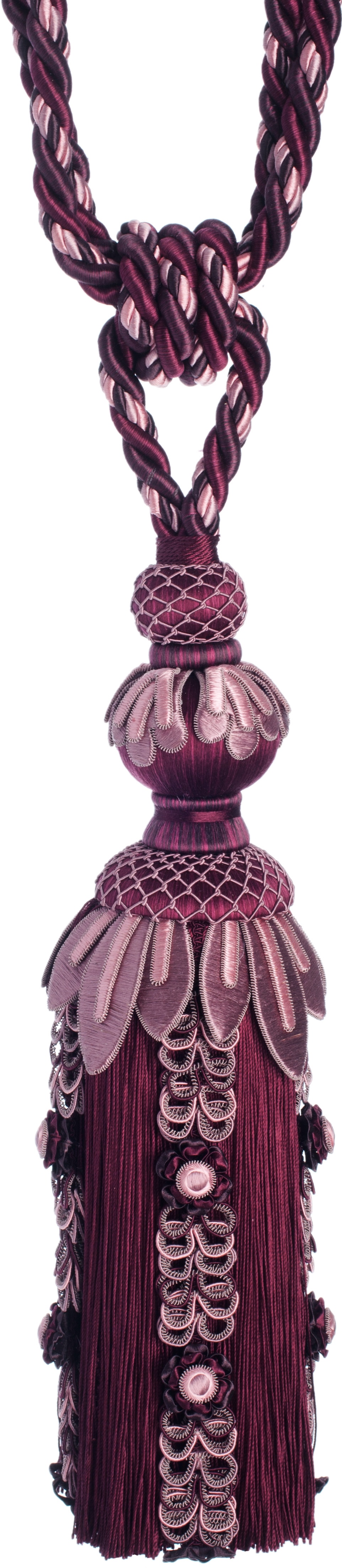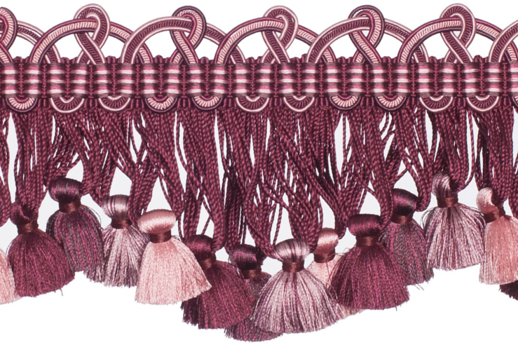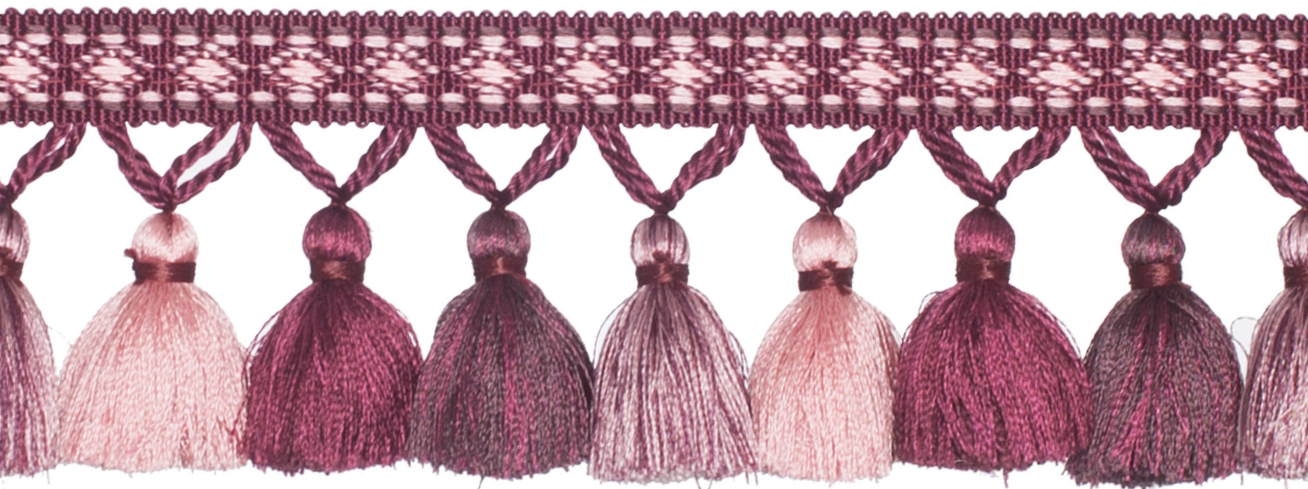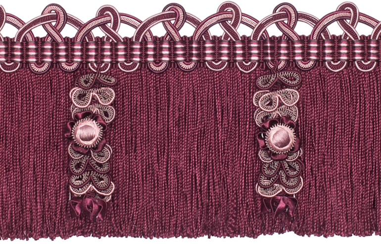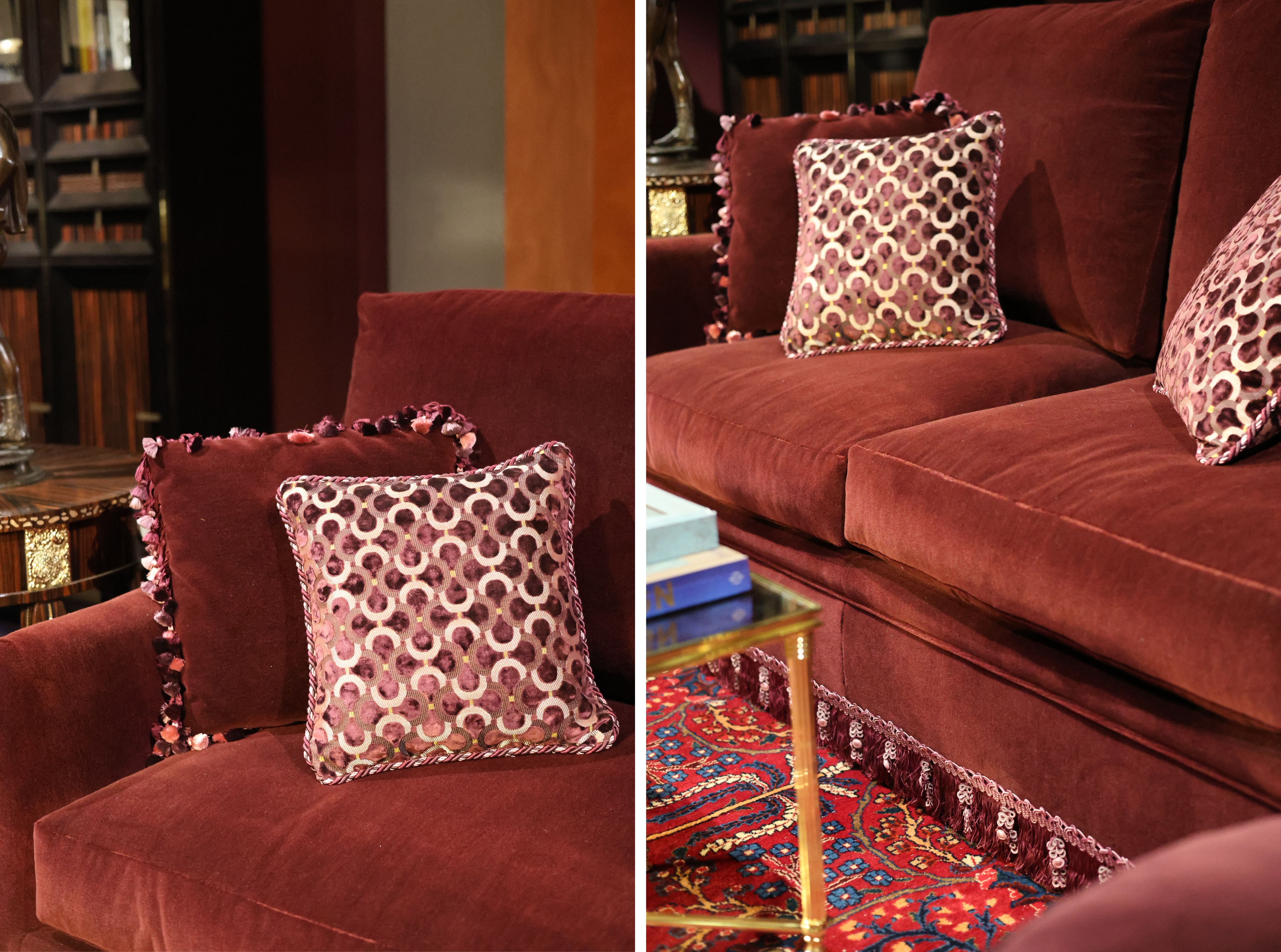 Draped in regal purple, the Library is layered with classical details from the Palais Collection in Amethyst. Plump throw pillows are trimmed with Cord, Tassel Fringe, and Scalloped Braid, while an inviting sofa is skirted in Fringe with Jasmines. Velvet drapery is gathered with jasmine-adorned Tiebacks, each secured by an ornate Rosette.