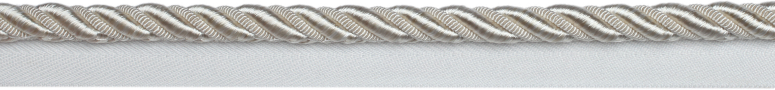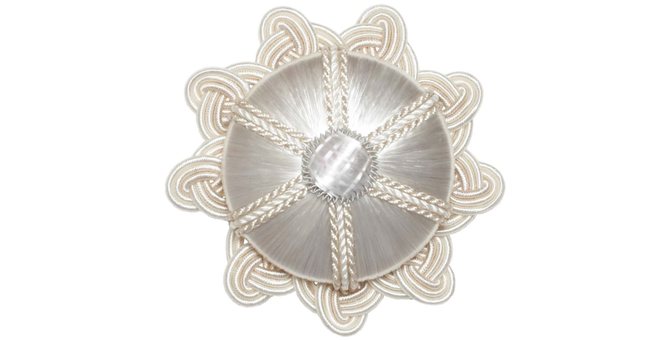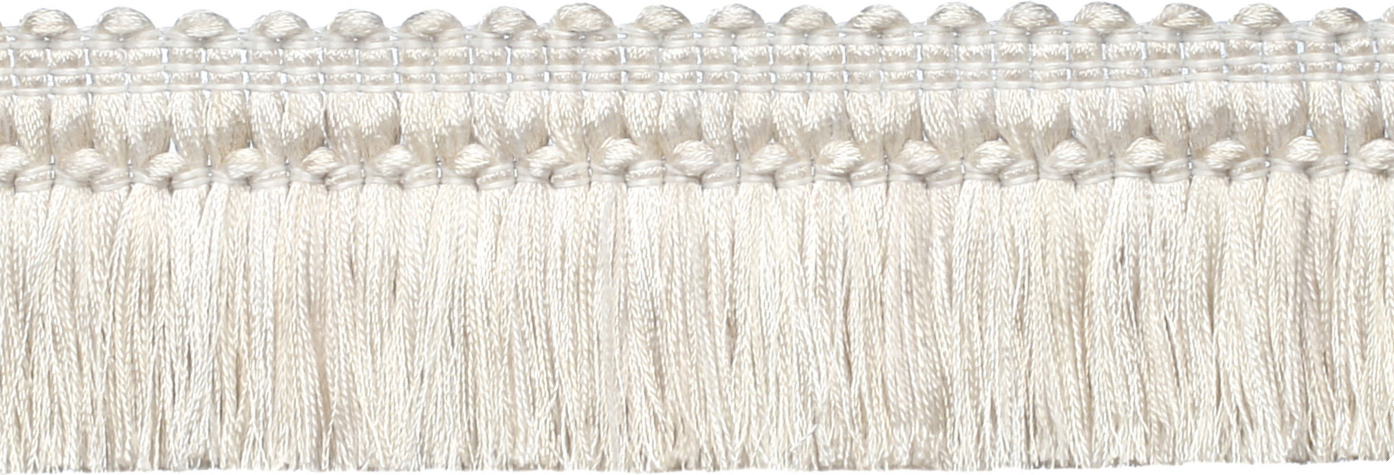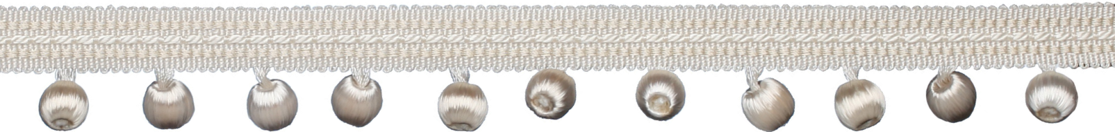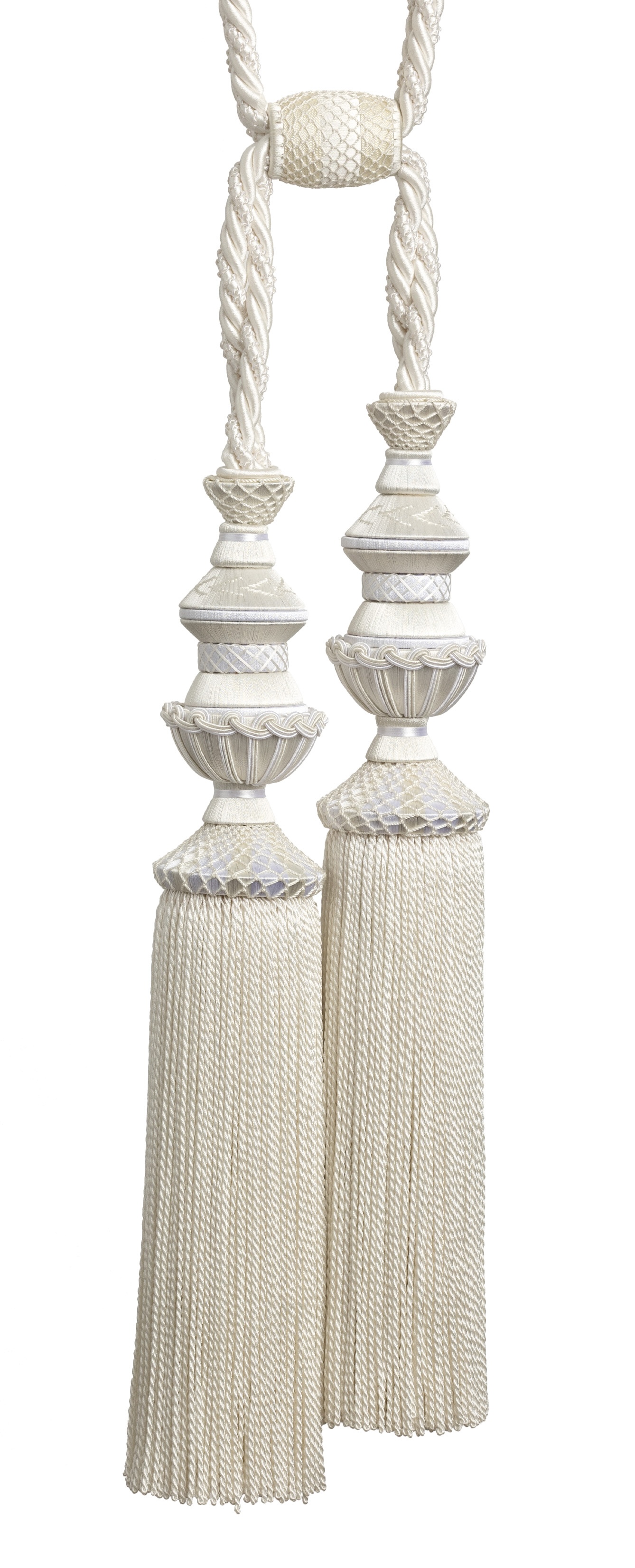 The bedroom is a serene oasis in shades of off-white. Three throw pillows, finished with the Aurelia Cord and Brush and Beaded Fringes in Ivory, add quiet detail to a bouclé banquet. Cream curtains are held back with the Trianon Double Tassel TIeback and Cord in Pearl, highlighting their soft, luxurious drape.