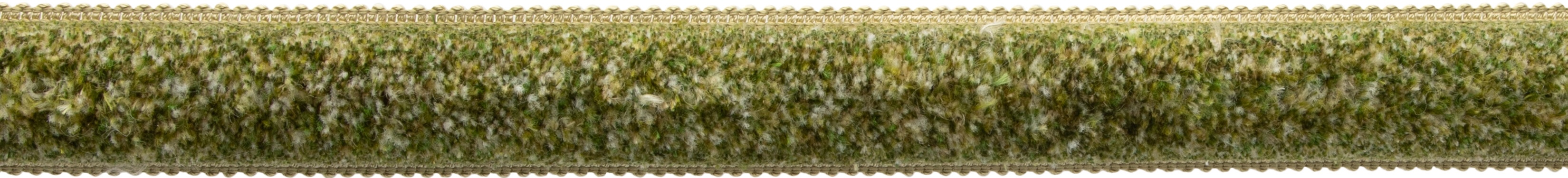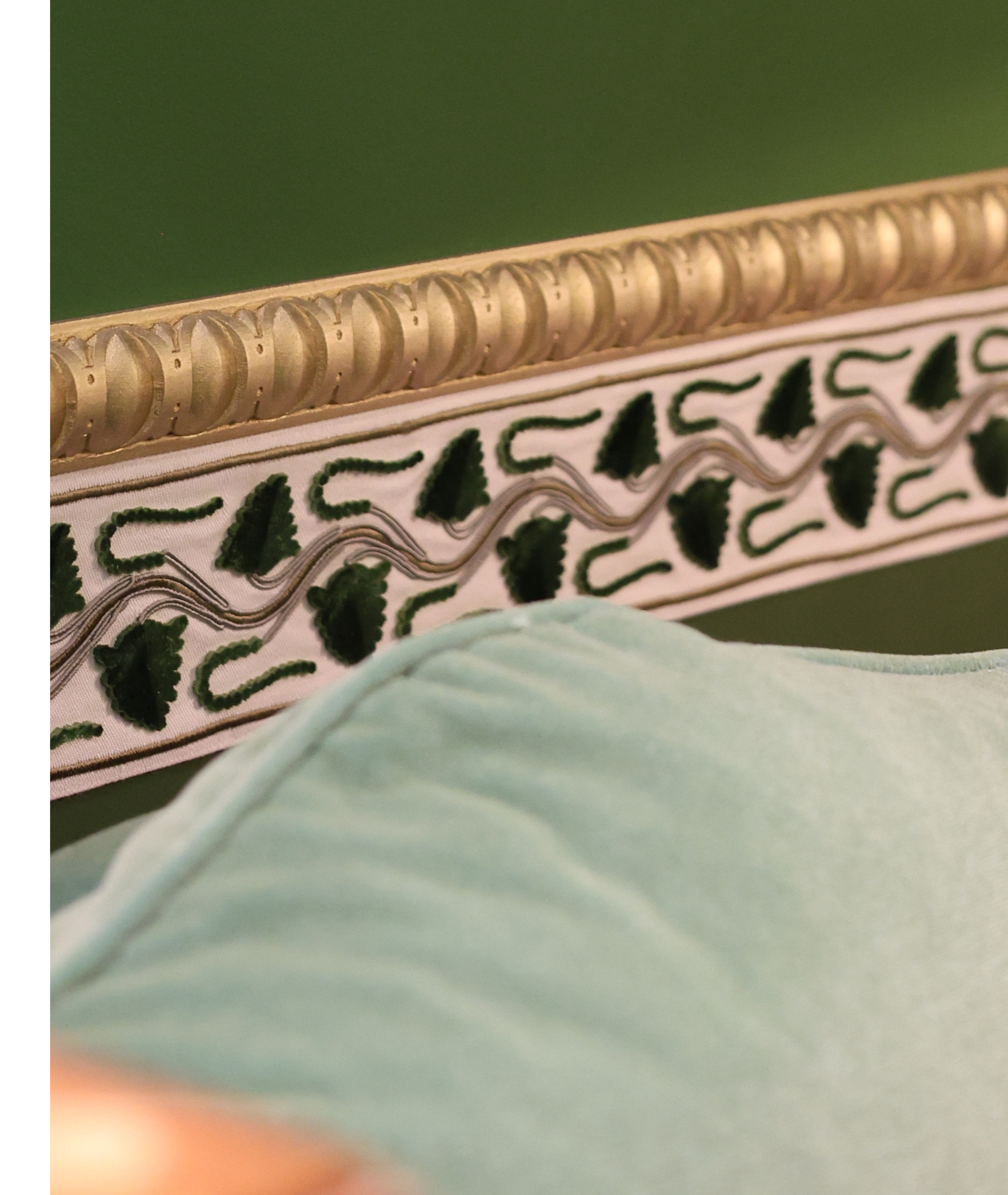 Two mirrored sofas gain rhythm and character from Tassel Skirt Fringe in Fern, while throw pillows are trimmed with coordinating CordMarabout, and Tassel Fringe. Along the walls, Daphne Velvet Border in Forest wraps just below the gold chair rail, adding movement and dimension.