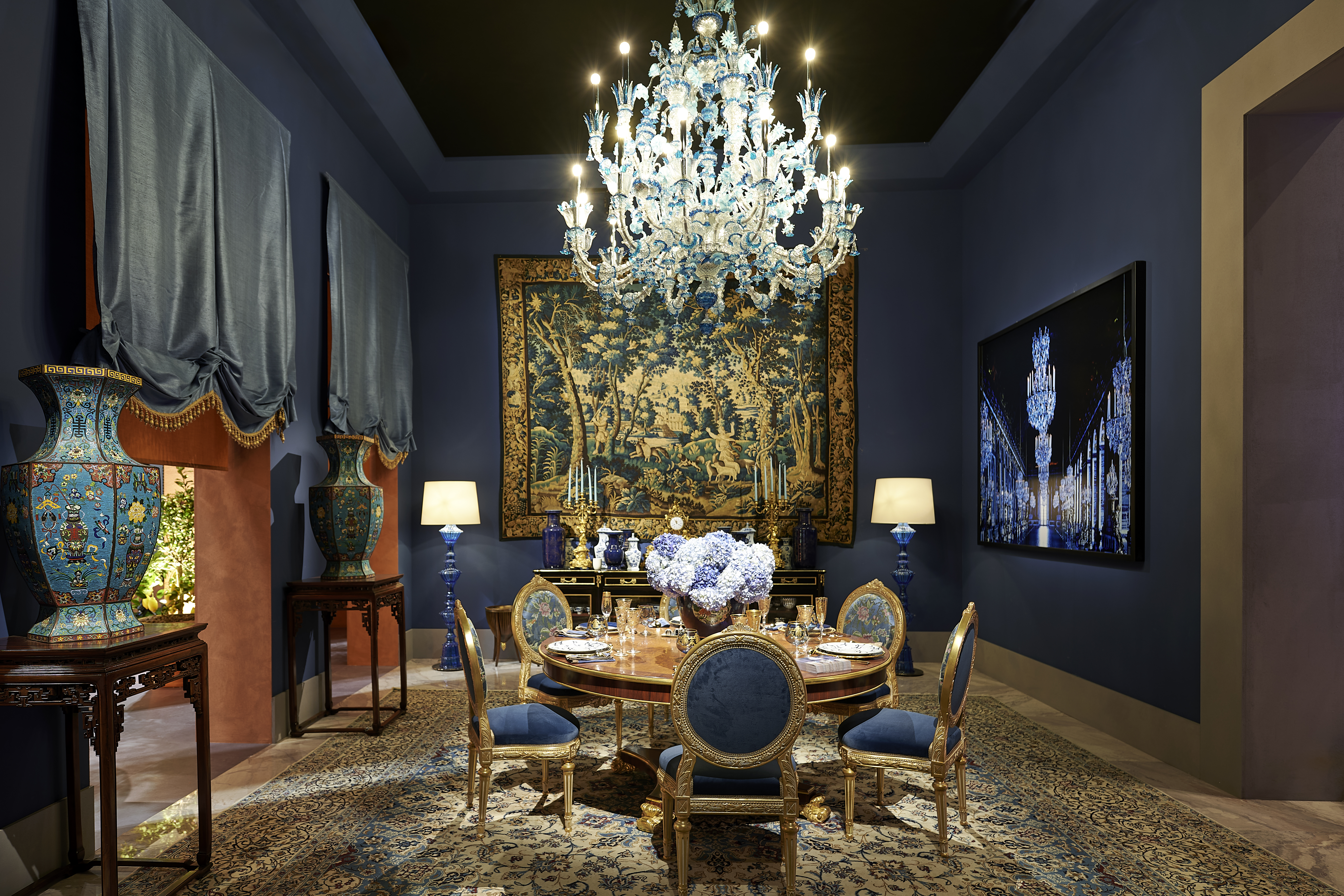 Amidst a sea of blue, the Dining Room drapery is given an ocher edge with the Normandy Silk Ornamental Fringe in Nuance D'or, complementing the gold accents around the room.