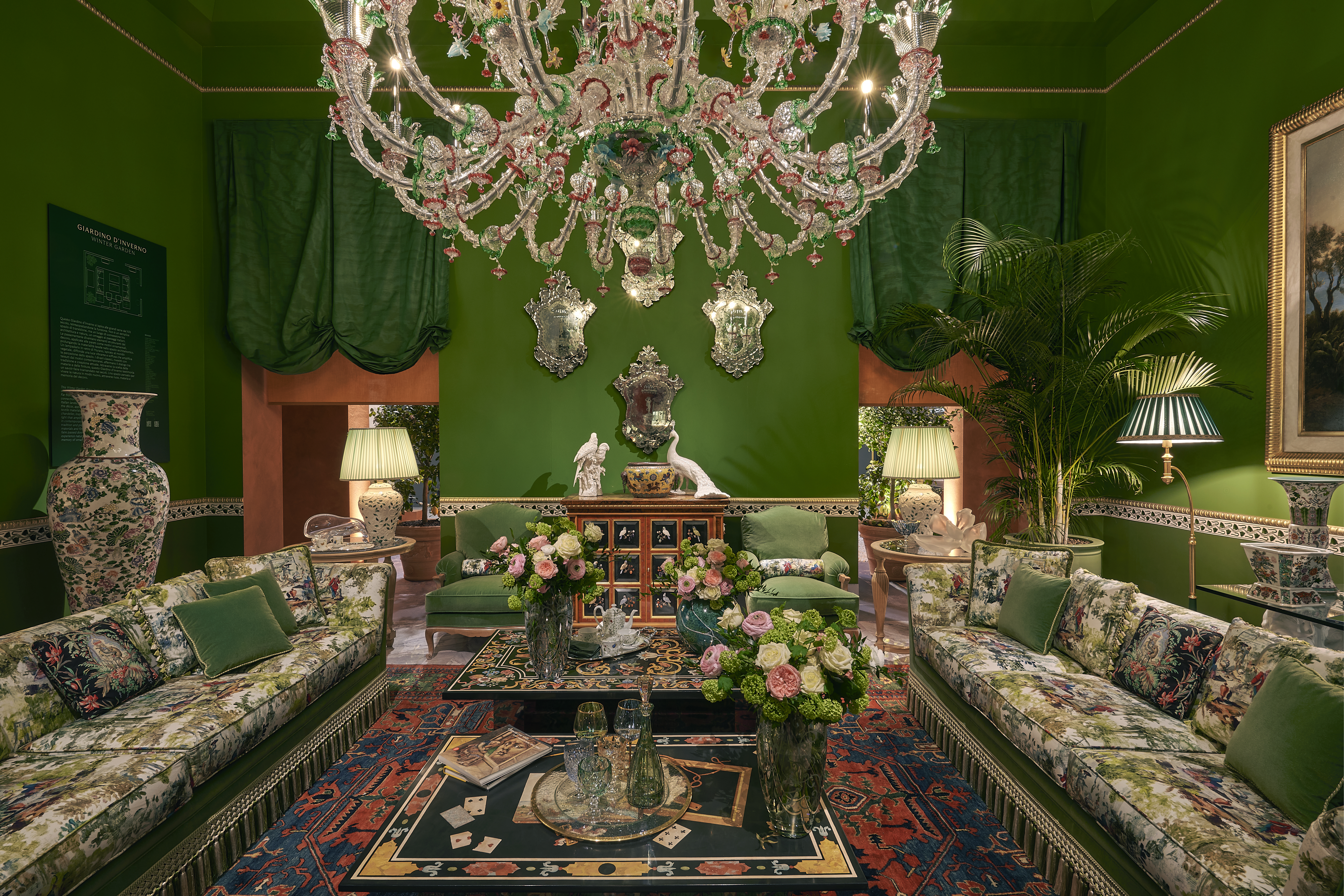 The Winter Garden is enveloped in rich, verdant hues, with The Bagatelle Collection by Timothy Corrigan taking center stage.