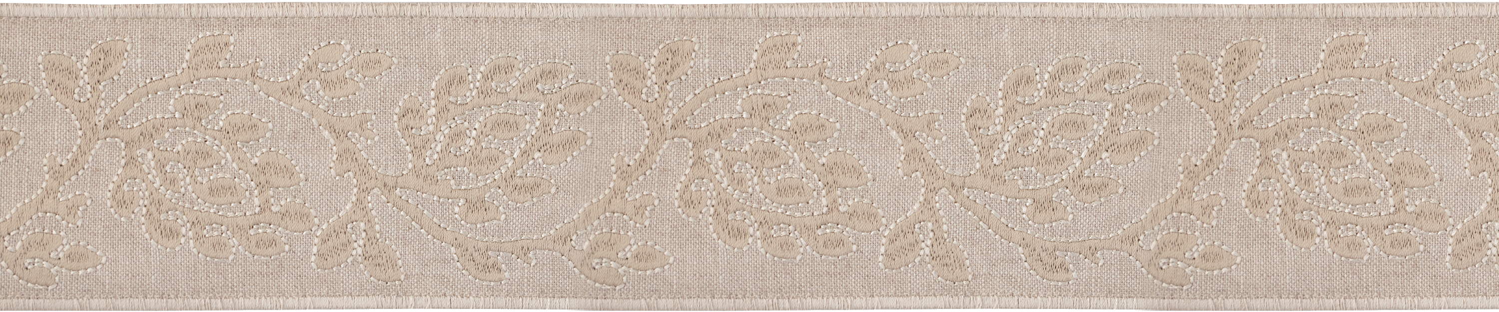 The Mare Embroidered Border in Dune adorns drapery leading edges from a Parisian-inspired bedroom by Gianpiero Gaglione.